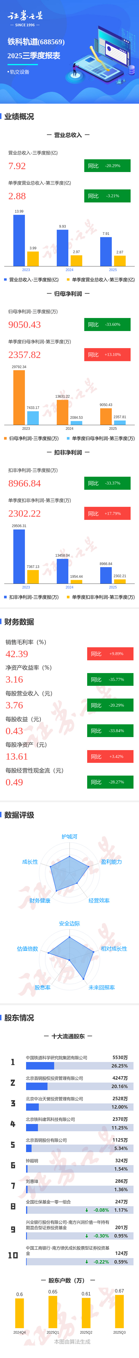 证券之星消息,铁科轨道2025年三季报显示,前三季度公司主营收入7.92亿元,同比下降20.3%;归母净利润9050.43万元,同比下降33.61%;扣非净利润8966.84万元,同比下降33.37%;其中2025年第三季度,公司单季度主营收入2.88亿元,同比下降3.21%;单季度归母净利润2357.82万元,同比上升13.11%;单季度扣非净利润2302.22万元,同比上升17.79%;负债率14.39%,投资收益-120.33万元,财务费用-1141.66万元,毛利率42.39%。