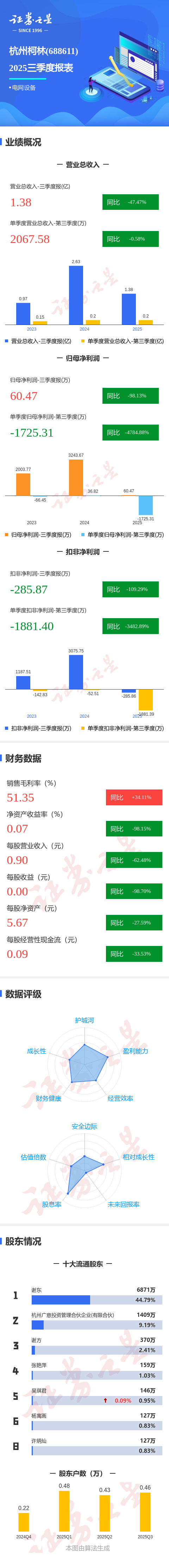 证券之星消息,杭州柯林2025年三季报显示,前三季度公司主营收入1.38亿元,同比下降47.48%;归母净利润60.47万元,同比下降98.14%;扣非净利润-285.87万元,同比下降109.29%;其中2025年第三季度,公司单季度主营收入2067.58万元,同比下降0.59%;单季度归母净利润-1725.31万元,同比下降4784.89%;单季度扣非净利润-1881.4万元,同比下降3482.9%;负债率19.38%,投资收益121.73万元,财务费用48.03万元,毛利率51.35%。