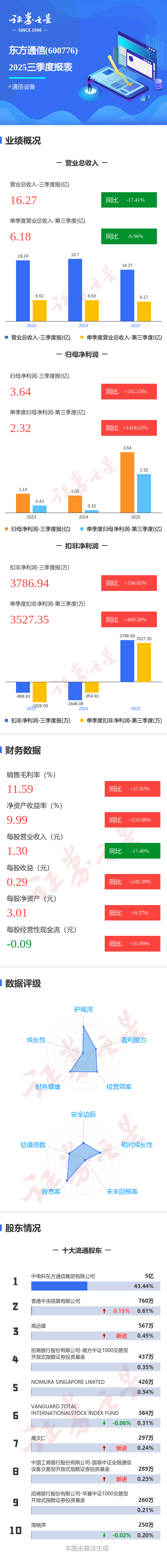 证券之星消息,东方通信2025年三季报显示,前三季度公司主营收入16.27亿元,同比下降17.41%;归母净利润3.64亿元,同比上升251.54%;扣非净利润3786.94万元,同比上升330.06%;其中2025年第三季度,公司单季度主营收入6.18亿元,同比下降6.96%;单季度归母净利润2.32亿元,同比上升1418.64%;单季度扣非净利润3527.35万元,同比上升469.39%;负债率19.89%,投资收益7003.13万元,财务费用-70.48万元,毛利率11.59%。
