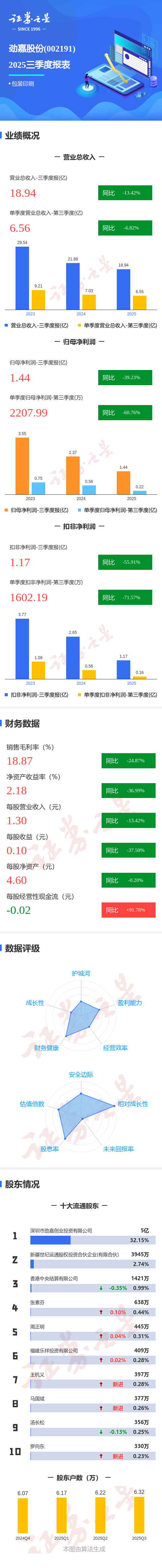 证券之星消息,劲嘉股份2025年三季报显示,前三季度公司主营收入18.94亿元,同比下降13.43%;归母净利润1.44亿元,同比下降39.23%;扣非净利润1.17亿元,同比下降55.92%;其中2025年第三季度,公司单季度主营收入6.56亿元,同比下降6.82%;单季度归母净利润2207.99万元,同比下降60.76%;单季度扣非净利润1602.19万元,同比下降71.58%;负债率19.16%,投资收益1.29亿元,财务费用1035.25万元,毛利率18.87%。