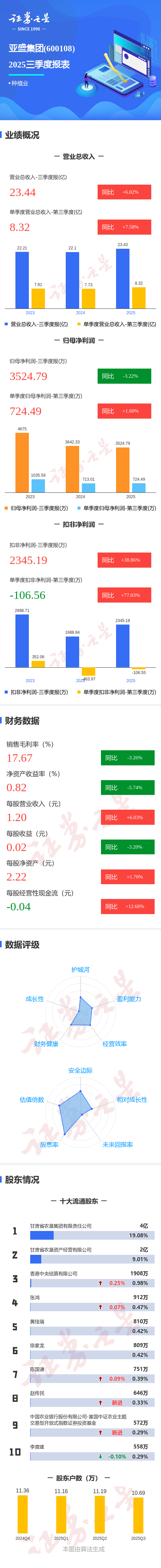 证券之星消息,亚盛集团2025年三季报显示,前三季度公司主营收入23.44亿元,同比上升6.03%;归母净利润3524.79万元,同比下降3.23%;扣非净利润2345.19万元,同比上升38.86%;其中2025年第三季度,公司单季度主营收入8.32亿元,同比上升7.59%;单季度归母净利润724.49万元,同比上升1.61%;单季度扣非净利润-106.56万元,同比上升77.03%;负债率56.9%,投资收益276.9万元,财务费用1.0亿元,毛利率17.67%。