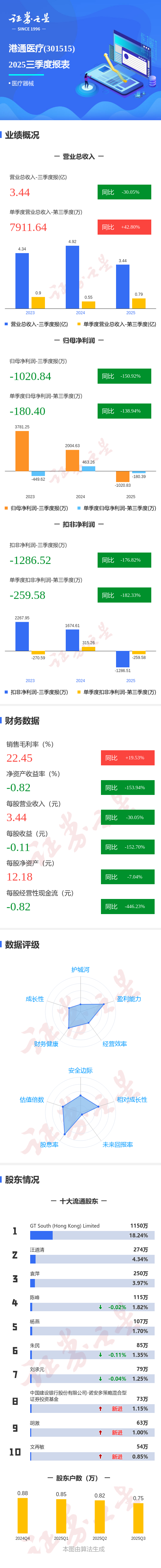 证券之星消息,港通医疗2025年三季报显示,前三季度公司主营收入3.44亿元,同比下降30.06%;归母净利润-1020.84万元,同比下降150.92%;扣非净利润-1286.52万元,同比下降176.82%;其中2025年第三季度,公司单季度主营收入7911.64万元,同比上升42.81%;单季度归母净利润-180.4万元,同比下降138.94%;单季度扣非净利润-259.58万元,同比下降182.34%;负债率40.94%,投资收益-17.94万元,财务费用54.24万元,毛利率22.45%。