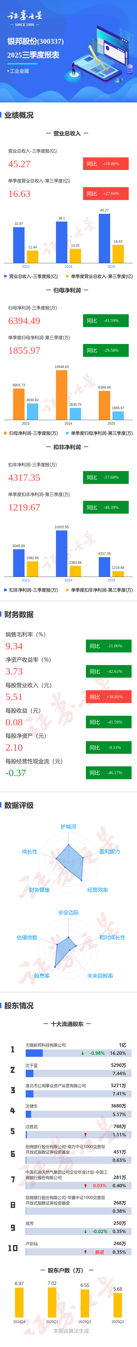 证券之星消息,银邦股份2025年三季报显示,前三季度公司主营收入45.27亿元,同比上升18.81%;归母净利润6394.49万元,同比下降41.6%;扣非净利润4317.35万元,同比下降57.69%;其中2025年第三季度,公司单季度主营收入16.63亿元,同比上升27.67%;单季度归母净利润1855.97万元,同比下降29.58%;单季度扣非净利润1219.67万元,同比下降48.4%;负债率73.44%,投资收益21.4万元,财务费用1.11亿元,毛利率9.34%。