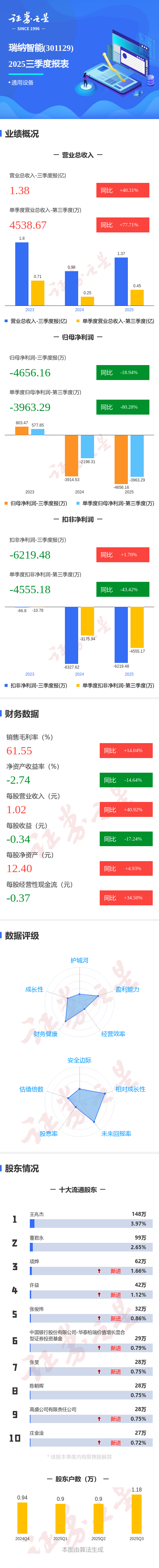 证券之星消息,瑞纳智能2025年三季报显示,前三季度公司主营收入1.38亿元,同比上升40.32%;归母净利润-4656.16万元,同比下降18.95%;扣非净利润-6219.48万元,同比上升1.71%;其中2025年第三季度,公司单季度主营收入4538.67万元,同比上升77.72%;单季度归母净利润-3963.29万元,同比下降80.29%;单季度扣非净利润-4555.18万元,同比下降43.43%;负债率20.5%,投资收益856.82万元,财务费用122.96万元,毛利率61.55%。