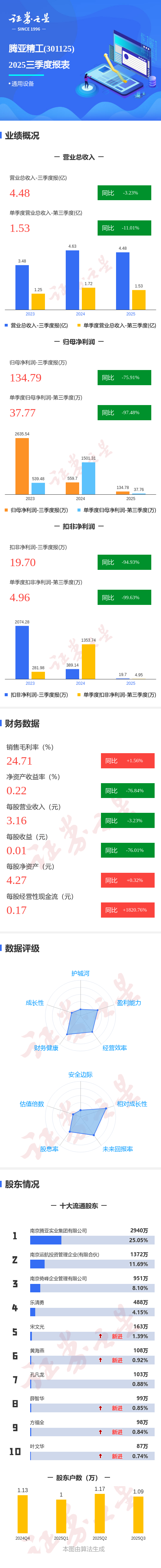 证券之星消息,腾亚精工2025年三季报显示,前三季度公司主营收入4.48亿元,同比下降3.24%;归母净利润134.79万元,同比下降75.92%;扣非净利润19.7万元,同比下降94.94%;其中2025年第三季度,公司单季度主营收入1.53亿元,同比下降11.02%;单季度归母净利润37.77万元,同比下降97.48%;单季度扣非净利润4.96万元,同比下降99.63%;负债率38.09%,财务费用476.66万元,毛利率24.71%。