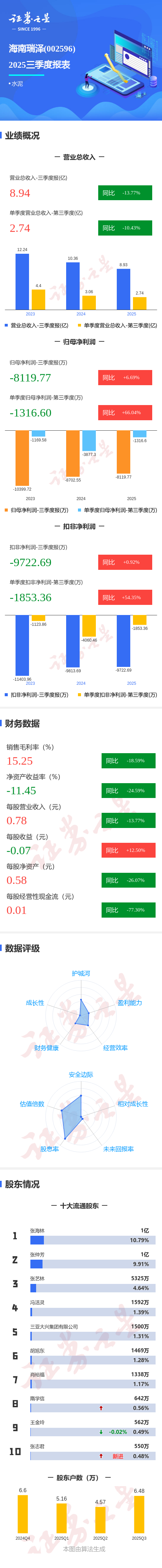 证券之星消息,海南瑞泽2025年三季报显示,前三季度公司主营收入8.94亿元,同比下降13.77%;归母净利润-8119.77万元,同比上升6.7%;扣非净利润-9722.69万元,同比上升0.93%;其中2025年第三季度,公司单季度主营收入2.74亿元,同比下降10.44%;单季度归母净利润-1316.6万元,同比上升66.04%;单季度扣非净利润-1853.36万元,同比上升54.36%;负债率80.32%,投资收益446.33万元,财务费用5786.52万元,毛利率15.25%。