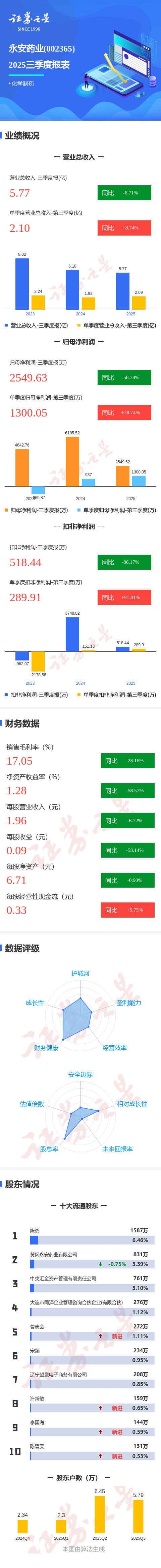 证券之星消息,永安药业2025年三季报显示,前三季度公司主营收入5.77亿元,同比下降6.72%;归母净利润2549.63万元,同比下降58.78%;扣非净利润518.44万元,同比下降86.17%;其中2025年第三季度,公司单季度主营收入2.1亿元,同比上升8.75%;单季度归母净利润1300.05万元,同比上升38.75%;单季度扣非净利润289.91万元,同比上升91.82%;负债率10.93%,投资收益2532.25万元,财务费用-123.0万元,毛利率17.05%。