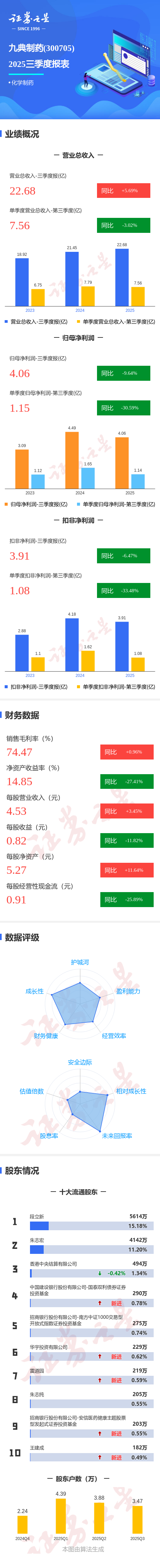 证券之星消息,九典制药2025年三季报显示,前三季度公司主营收入22.68亿元,同比上升5.69%;归母净利润4.06亿元,同比下降9.64%;扣非净利润3.91亿元,同比下降6.47%;其中2025年第三季度,公司单季度主营收入7.56亿元,同比下降3.03%;单季度归母净利润1.15亿元,同比下降30.59%;单季度扣非净利润1.08亿元,同比下降33.48%;负债率26.59%,投资收益-34.4万元,财务费用853.76万元,毛利率74.47%。
