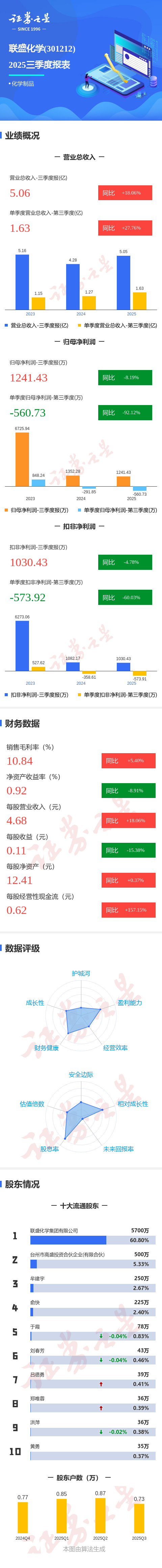 证券之星消息,联盛化学2025年三季报显示,前三季度公司主营收入5.06亿元,同比上升18.06%;归母净利润1241.43万元,同比下降8.2%;扣非净利润1030.43万元,同比下降4.78%;其中2025年第三季度,公司单季度主营收入1.63亿元,同比上升27.76%;单季度归母净利润-560.73万元,同比下降92.13%;单季度扣非净利润-573.92万元,同比下降60.04%;负债率20.98%,投资收益99.99万元,财务费用-257.0万元,毛利率10.84%。