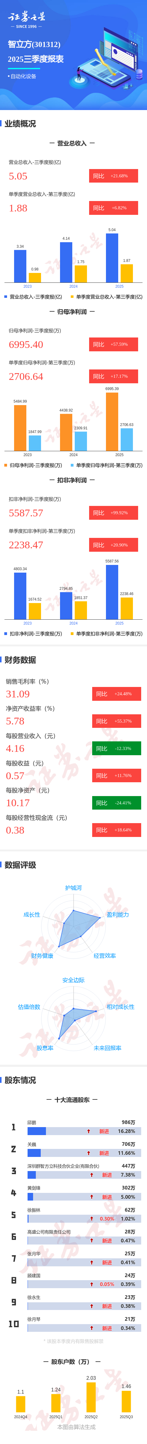 证券之星消息,智立方2025年三季报显示,前三季度公司主营收入5.05亿元,同比上升21.69%;归母净利润6995.4万元,同比上升57.59%;扣非净利润5587.57万元,同比上升99.92%;其中2025年第三季度,公司单季度主营收入1.88亿元,同比上升6.82%;单季度归母净利润2706.64万元,同比上升17.17%;单季度扣非净利润2238.47万元,同比上升20.91%;负债率19.08%,投资收益111.76万元,财务费用94.59万元,毛利率31.09%。