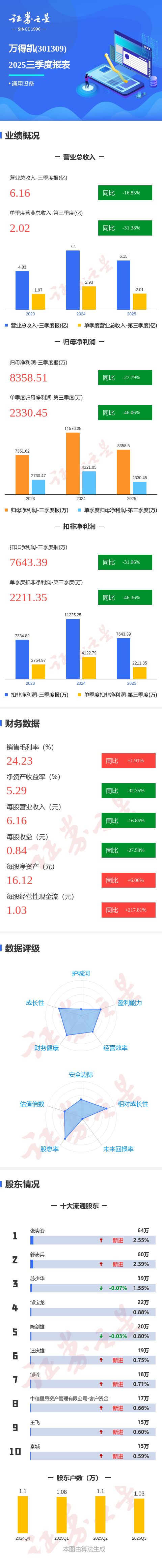 证券之星消息,万得凯2025年三季报显示,前三季度公司主营收入6.16亿元,同比下降16.85%;归母净利润8358.51万元,同比下降27.8%;扣非净利润7643.39万元,同比下降31.97%;其中2025年第三季度,公司单季度主营收入2.02亿元,同比下降31.38%;单季度归母净利润2330.45万元,同比下降46.07%;单季度扣非净利润2211.35万元,同比下降46.36%;负债率9.98%,投资收益584.4万元,财务费用-167.32万元,毛利率24.23%。