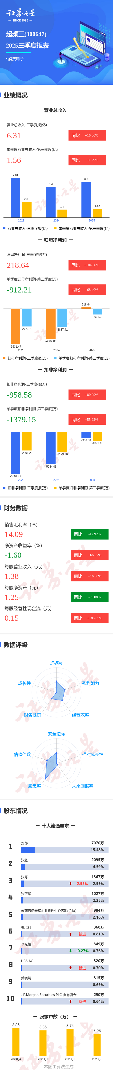 证券之星消息,超频三2025年三季报显示,前三季度公司主营收入6.31亿元,同比上升16.6%;归母净利润218.64万元,同比上升104.67%;扣非净利润-958.58万元,同比上升81.0%;其中2025年第三季度,公司单季度主营收入1.56亿元,同比上升11.29%;单季度归母净利润-912.21万元,同比上升68.41%;单季度扣非净利润-1379.15万元,同比上升55.93%;负债率73.44%,投资收益13.39万元,财务费用3056.84万元,毛利率14.09%。