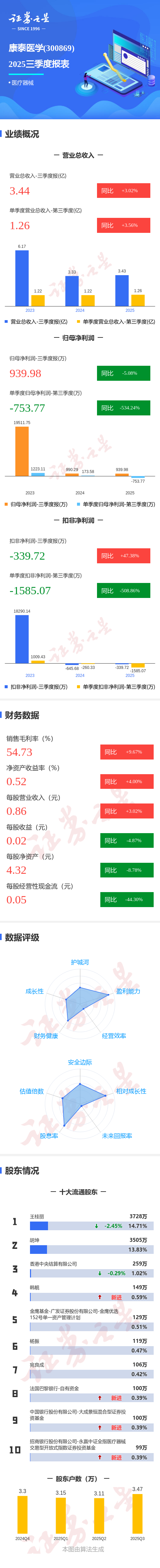 证券之星消息,康泰医学2025年三季报显示,前三季度公司主营收入3.44亿元,同比上升3.03%;归母净利润939.98万元,同比下降5.08%;扣非净利润-339.72万元,同比上升47.39%;其中2025年第三季度,公司单季度主营收入1.26亿元,同比上升3.56%;单季度归母净利润-753.77万元,同比下降534.25%;单季度扣非净利润-1585.07万元,同比下降508.87%;负债率36.72%,投资收益663.32万元,财务费用-224.59万元,毛利率54.73%。