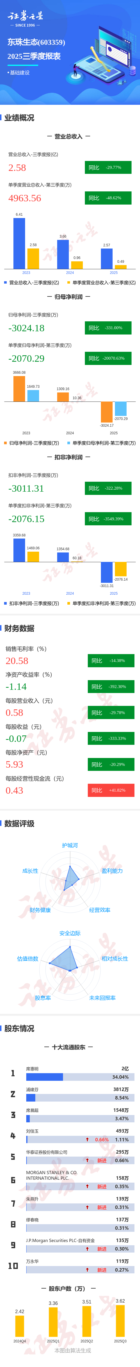 证券之星消息,东珠生态2025年三季报显示,前三季度公司主营收入2.58亿元,同比下降29.78%;归母净利润-3024.18万元,同比下降331.0%;扣非净利润-3011.31万元,同比下降322.29%;其中2025年第三季度,公司单季度主营收入4963.56万元,同比下降48.62%;单季度归母净利润-2070.29万元,同比下降20070.63%;单季度扣非净利润-2076.15万元,同比下降3549.39%;负债率58.93%,投资收益-6.81万元,财务费用1846.36万元,毛利率20.58%。