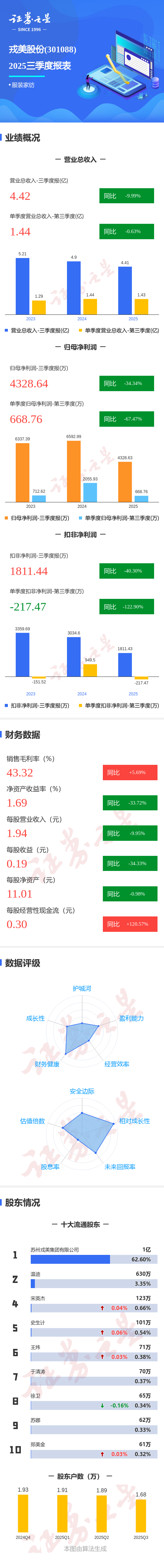 证券之星消息,戎美股份2025年三季报显示,前三季度公司主营收入4.42亿元,同比下降9.99%;归母净利润4328.64万元,同比下降34.34%;扣非净利润1811.44万元,同比下降40.31%;其中2025年第三季度,公司单季度主营收入1.44亿元,同比下降0.64%;单季度归母净利润668.76万元,同比下降67.47%;单季度扣非净利润-217.47万元,同比下降122.9%;负债率2.32%,投资收益1081.87万元,财务费用247.67万元,毛利率43.32%。
