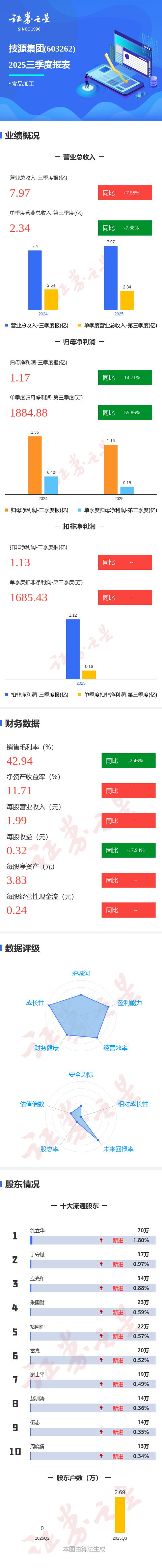 证券之星消息,技源集团2025年三季报显示,前三季度公司主营收入7.97亿元,同比上升7.58%;归母净利润1.17亿元,同比下降14.72%;扣非净利润1.13亿元,其中2025年第三季度,公司单季度主营收入2.34亿元,同比下降7.88%;单季度归母净利润1884.88万元,同比下降55.87%;单季度扣非净利润1685.43万元,负债率14.84%,投资收益171.28万元,财务费用-800.19万元,毛利率42.94%。