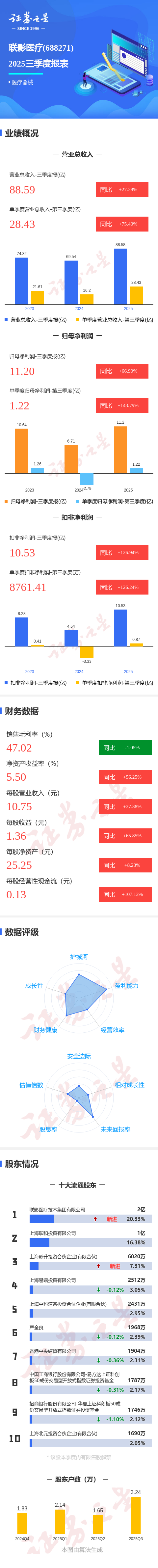 证券之星消息,联影医疗2025年三季报显示,前三季度公司主营收入88.59亿元,同比上升27.39%;归母净利润11.2亿元,同比上升66.91%;扣非净利润10.53亿元,同比上升126.94%;其中2025年第三季度,公司单季度主营收入28.43亿元,同比上升75.41%;单季度归母净利润1.22亿元,同比上升143.8%;单季度扣非净利润8761.41万元,同比上升126.24%;负债率30.08%,投资收益6068.47万元,财务费用-4382.33万元,毛利率47.02%。