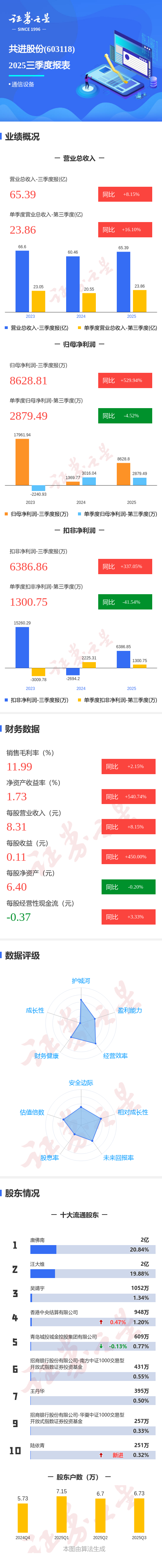 证券之星消息,共进股份2025年三季报显示,前三季度公司主营收入65.39亿元,同比上升8.15%;归母净利润8628.81万元,同比上升529.94%;扣非净利润6386.86万元,同比上升337.06%;其中2025年第三季度,公司单季度主营收入23.86亿元,同比上升16.1%;单季度归母净利润2879.49万元,同比下降4.53%;单季度扣非净利润1300.75万元,同比下降41.55%;负债率58.74%,投资收益-146.28万元,财务费用4033.5万元,毛利率11.99%。