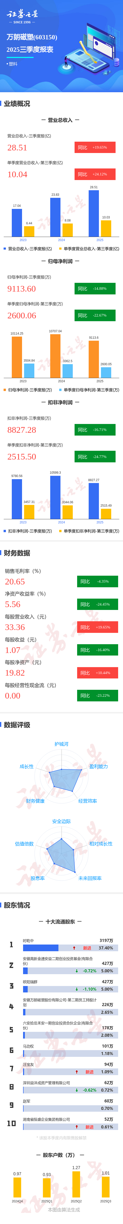 证券之星消息,万朗磁塑2025年三季报显示,前三季度公司主营收入28.51亿元,同比上升19.65%;归母净利润9113.6万元,同比下降14.88%;扣非净利润8827.28万元,同比下降16.72%;其中2025年第三季度,公司单季度主营收入10.04亿元,同比上升24.13%;单季度归母净利润2600.06万元,同比下降22.67%;单季度扣非净利润2515.5万元,同比下降24.78%;负债率64.38%,投资收益417.12万元,财务费用3040.72万元,毛利率20.65%。