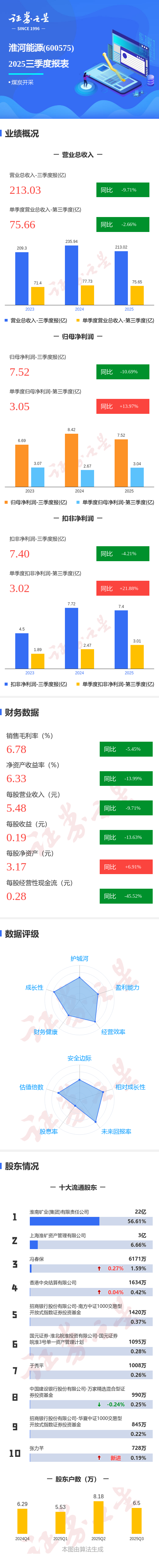 证券之星消息,淮河能源2025年三季报显示,前三季度公司主营收入213.03亿元,同比下降9.71%;归母净利润7.52亿元,同比下降10.69%;扣非净利润7.4亿元,同比下降4.22%;其中2025年第三季度,公司单季度主营收入75.66亿元,同比下降2.67%;单季度归母净利润3.05亿元,同比上升13.97%;单季度扣非净利润3.02亿元,同比上升21.89%;负债率41.61%,投资收益2.29亿元,财务费用1.19亿元,毛利率6.78%。