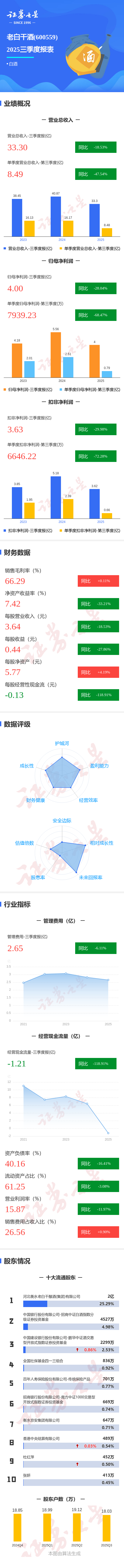 证券之星消息,老白干酒2025年三季报显示,前三季度公司主营收入33.3亿元,同比下降18.53%;归母净利润4.0亿元,同比下降28.04%;扣非净利润3.63亿元,同比下降29.99%;其中2025年第三季度,公司单季度主营收入8.49亿元,同比下降47.55%;单季度归母净利润7939.23万元,同比下降68.48%;单季度扣非净利润6646.22万元,同比下降72.29%;负债率40.16%,投资收益1247.75万元,财务费用-1048.96万元,毛利率66.29%。