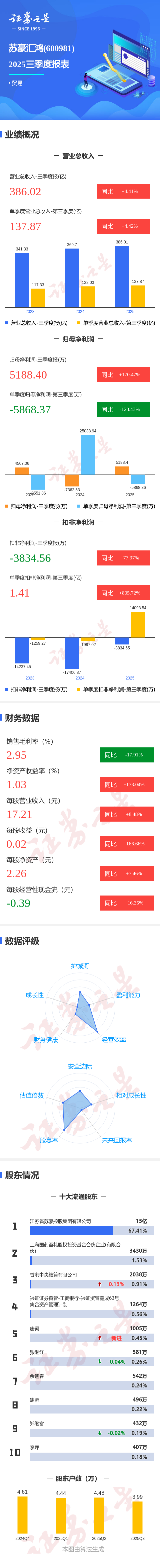 证券之星消息,苏豪汇鸿2025年三季报显示,前三季度公司主营收入386.02亿元,同比上升4.41%;归母净利润5188.4万元,同比上升170.47%;扣非净利润-3834.56万元,同比上升77.97%;其中2025年第三季度,公司单季度主营收入137.87亿元,同比上升4.42%;单季度归母净利润-5868.37万元,同比下降123.44%;单季度扣非净利润1.41亿元,同比上升805.73%;负债率78.87%,投资收益4230.5万元,财务费用2.05亿元,毛利率2.95%。