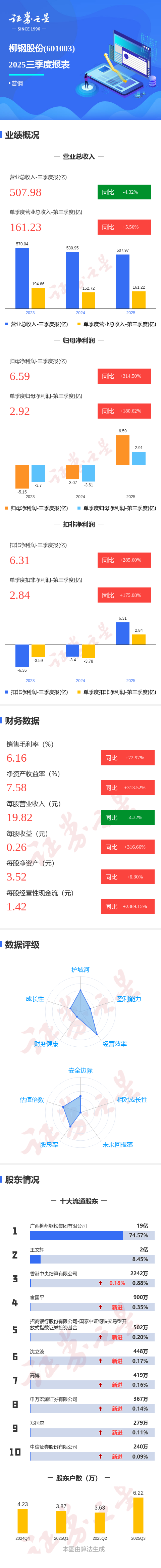 证券之星消息,柳钢股份2025年三季报显示,前三季度公司主营收入507.98亿元,同比下降4.33%;归母净利润6.59亿元,同比上升314.5%;扣非净利润6.31亿元,同比上升285.61%;其中2025年第三季度,公司单季度主营收入161.23亿元,同比上升5.57%;单季度归母净利润2.92亿元,同比上升180.63%;单季度扣非净利润2.84亿元,同比上升175.08%;负债率65.36%,投资收益84.52万元,财务费用7.18亿元,毛利率6.16%。