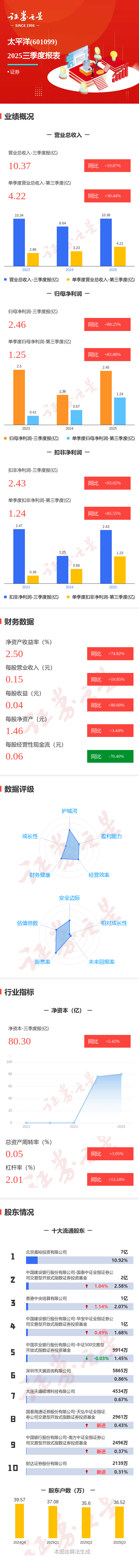 证券之星消息,太平洋2025年三季报显示,前三季度公司主营收入10.37亿元,同比上升19.88%;归母净利润2.46亿元,同比上升80.26%;扣非净利润2.43亿元,同比上升93.03%;其中2025年第三季度,公司单季度主营收入4.22亿元,同比上升30.45%;单季度归母净利润1.25亿元,同比上升83.89%;单季度扣非净利润1.24亿元,同比上升85.56%;负债率50.28%,投资收益3.05亿元。