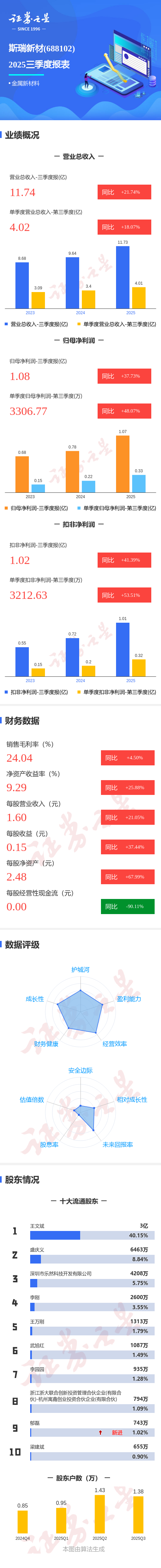 证券之星消息,斯瑞新材2025年三季报显示,前三季度公司主营收入11.74亿元,同比上升21.74%;归母净利润1.08亿元,同比上升37.74%;扣非净利润1.02亿元,同比上升41.39%;其中2025年第三季度,公司单季度主营收入4.02亿元,同比上升18.08%;单季度归母净利润3306.77万元,同比上升48.07%;单季度扣非净利润3212.63万元,同比上升53.52%;负债率40.34%,投资收益-252.56万元,财务费用842.44万元,毛利率24.04%。