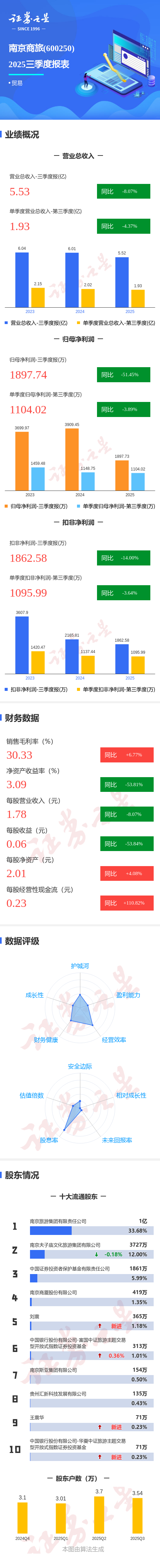 证券之星消息,南京商旅2025年三季报显示,前三季度公司主营收入5.53亿元,同比下降8.07%;归母净利润1897.74万元,同比下降51.46%;扣非净利润1862.58万元,同比下降14.0%;其中2025年第三季度,公司单季度主营收入1.93亿元,同比下降4.38%;单季度归母净利润1104.02万元,同比下降3.89%;单季度扣非净利润1095.99万元,同比下降3.64%;负债率53.9%,投资收益1351.26万元,财务费用1491.77万元,毛利率30.33%。