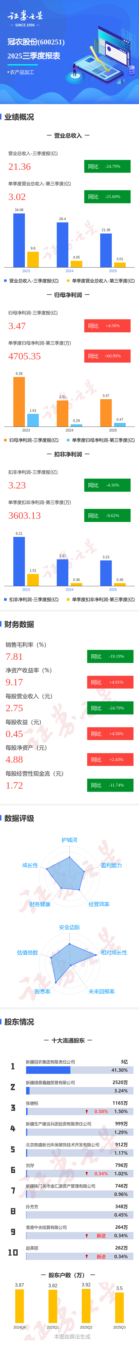 证券之星消息,冠农股份2025年三季报显示,前三季度公司主营收入21.36亿元,同比下降24.8%;归母净利润3.47亿元,同比上升4.56%;扣非净利润3.23亿元,同比下降4.16%;其中2025年第三季度,公司单季度主营收入3.02亿元,同比下降25.6%;单季度归母净利润4705.35万元,同比上升60.99%;单季度扣非净利润3603.13万元,同比下降0.63%;负债率32.77%,投资收益4.05亿元,财务费用1535.46万元,毛利率7.81%。
