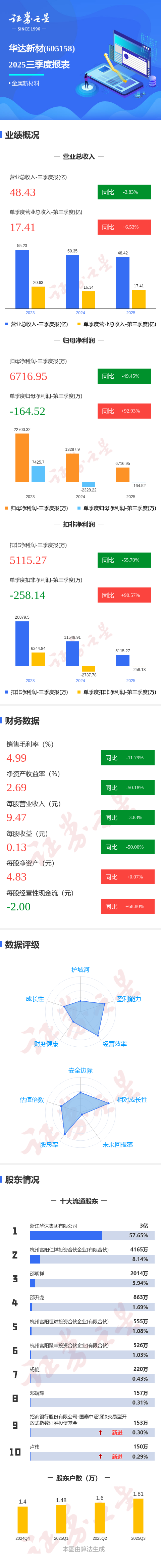 证券之星消息,华达新材2025年三季报显示,前三季度公司主营收入48.43亿元,同比下降3.83%;归母净利润6716.95万元,同比下降49.45%;扣非净利润5115.27万元,同比下降55.71%;其中2025年第三季度,公司单季度主营收入17.41亿元,同比上升6.54%;单季度归母净利润-164.52万元,同比上升92.93%;单季度扣非净利润-258.14万元,同比上升90.57%;负债率70.59%,投资收益1358.28万元,财务费用-3389.73万元,毛利率4.99%。