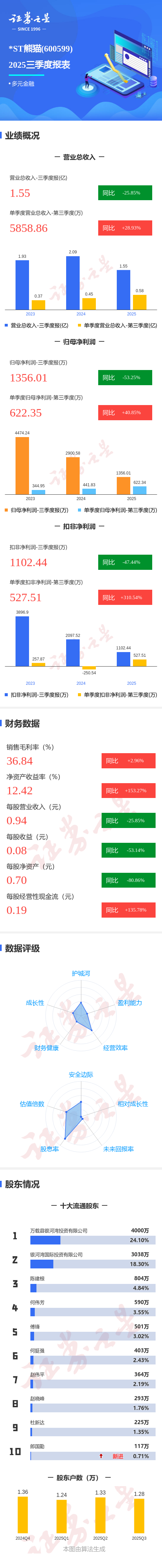 证券之星消息,*ST熊猫2025年三季报显示,前三季度公司主营收入1.55亿元,同比下降25.86%;归母净利润1356.01万元,同比下降53.25%;扣非净利润1102.44万元,同比下降47.44%;其中2025年第三季度,公司单季度主营收入5858.86万元,同比上升28.93%;单季度归母净利润622.35万元,同比上升40.86%;单季度扣非净利润527.51万元,同比上升310.54%;负债率71.53%,投资收益0.2万元,财务费用341.7万元,毛利率36.84%。
