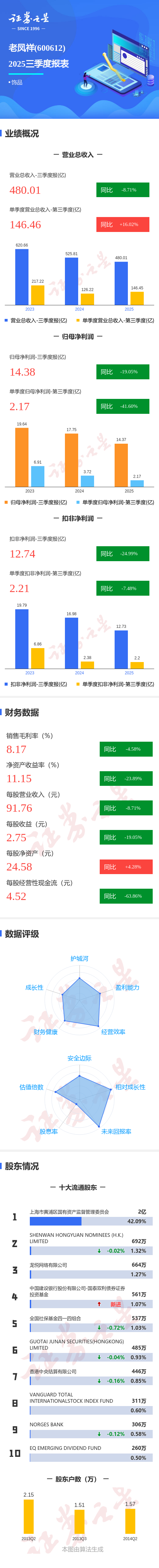 证券之星消息,老凤祥2025年三季报显示,前三季度公司主营收入480.01亿元,同比下降8.71%;归母净利润14.38亿元,同比下降19.05%;扣非净利润12.74亿元,同比下降24.99%;其中2025年第三季度,公司单季度主营收入146.46亿元,同比上升16.03%;单季度归母净利润2.17亿元,同比下降41.61%;单季度扣非净利润2.21亿元,同比下降7.48%;负债率39.25%,投资收益-6917.6万元,财务费用1.22亿元,毛利率8.17%。