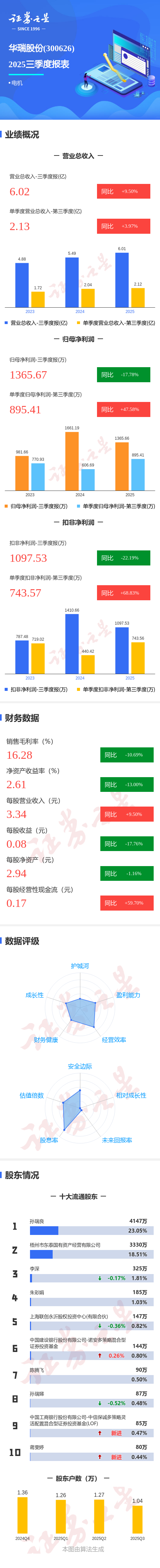 证券之星消息,华瑞股份2025年三季报显示,前三季度公司主营收入6.02亿元,同比上升9.51%;归母净利润1365.67万元,同比下降17.79%;扣非净利润1097.53万元,同比下降22.2%;其中2025年第三季度,公司单季度主营收入2.13亿元,同比上升3.98%;单季度归母净利润895.41万元,同比上升47.59%;单季度扣非净利润743.57万元,同比上升68.83%;负债率39.86%,投资收益-1475.77万元,财务费用347.12万元,毛利率16.28%。