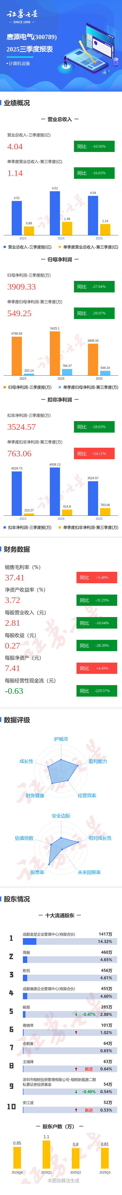 证券之星消息,唐源电气2025年三季报显示,前三季度公司主营收入4.04亿元,同比下降10.56%;归母净利润3909.33万元,同比下降27.94%;扣非净利润3524.57万元,同比下降28.64%;其中2025年第三季度,公司单季度主营收入1.14亿元,同比下降16.66%;单季度归母净利润549.25万元,同比下降29.98%;单季度扣非净利润763.06万元,同比上升24.11%;负债率29.78%,投资收益452.83万元,财务费用50.68万元,毛利率37.41%。