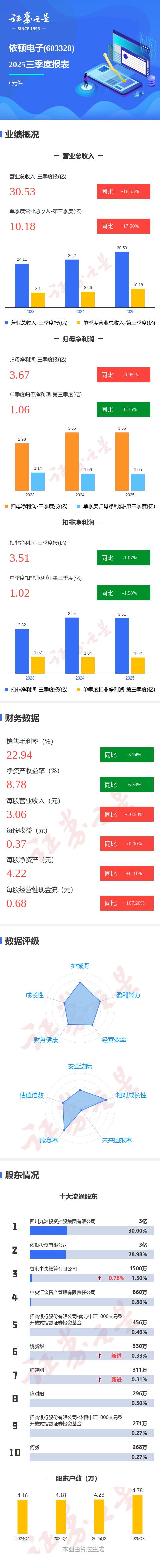 证券之星消息,依顿电子2025年三季报显示,前三季度公司主营收入30.53亿元,同比上升16.53%;归母净利润3.67亿元,同比上升0.06%;扣非净利润3.51亿元,同比下降1.07%;其中2025年第三季度,公司单季度主营收入10.18亿元,同比上升17.5%;单季度归母净利润1.06亿元,同比下降0.16%;单季度扣非净利润1.02亿元,同比下降1.98%;负债率35.63%,投资收益2622.21万元,财务费用264.32万元,毛利率22.94%。