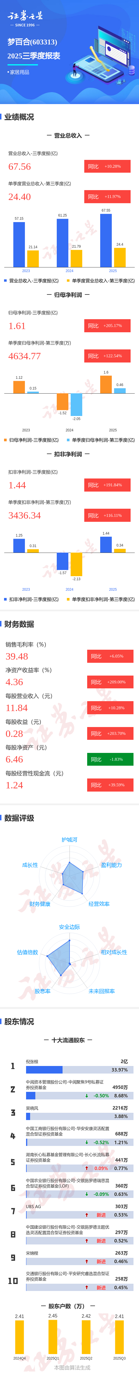证券之星消息,梦百合2025年三季报显示,前三季度公司主营收入67.56亿元,同比上升10.29%;归母净利润1.61亿元,同比上升205.18%;扣非净利润1.44亿元,同比上升191.84%;其中2025年第三季度,公司单季度主营收入24.4亿元,同比上升11.98%;单季度归母净利润4634.77万元,同比上升122.55%;单季度扣非净利润3436.34万元,同比上升116.11%;负债率61.87%,投资收益-48.67万元,财务费用1.63亿元,毛利率39.48%。