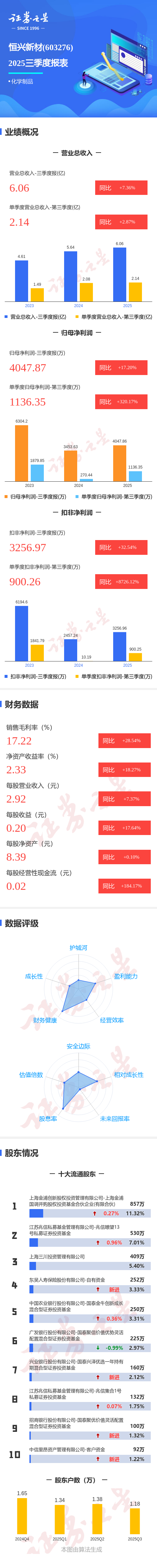 证券之星消息,恒兴新材2025年三季报显示,前三季度公司主营收入6.06亿元,同比上升7.37%;归母净利润4047.87万元,同比上升17.21%;扣非净利润3256.97万元,同比上升32.55%;其中2025年第三季度,公司单季度主营收入2.14亿元,同比上升2.87%;单季度归母净利润1136.35万元,同比上升320.18%;单季度扣非净利润900.26万元,同比上升8726.12%;负债率8.13%,投资收益709.44万元,财务费用34.89万元,毛利率17.22%。