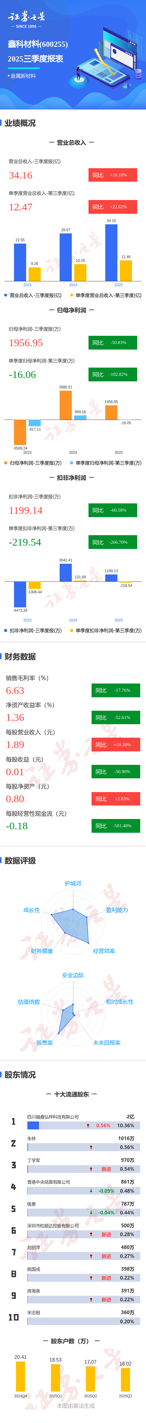 证券之星消息,鑫科材料2025年三季报显示,前三季度公司主营收入34.16亿元,同比上升19.1%;归母净利润1956.95万元,同比下降50.84%;扣非净利润1199.14万元,同比下降60.59%;其中2025年第三季度,公司单季度主营收入12.47亿元,同比上升22.62%;单季度归母净利润-16.06万元,同比下降102.82%;单季度扣非净利润-219.54万元,同比下降266.71%;负债率59.24%,投资收益-121.92万元,财务费用2502.19万元,毛利率6.63%。
