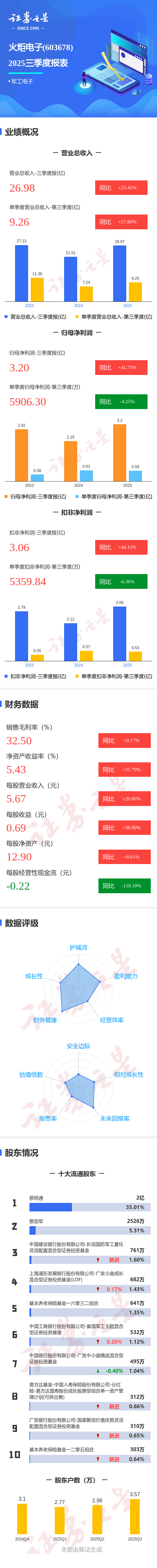 证券之星消息,火炬电子2025年三季报显示,前三季度公司主营收入26.98亿元,同比上升25.41%;归母净利润3.2亿元,同比上升41.76%;扣非净利润3.06亿元,同比上升44.11%;其中2025年第三季度,公司单季度主营收入9.26亿元,同比上升27.8%;单季度归母净利润5906.3万元,同比下降4.26%;单季度扣非净利润5359.84万元,同比下降6.37%;负债率24.79%,投资收益489.54万元,财务费用1406.19万元,毛利率32.5%。