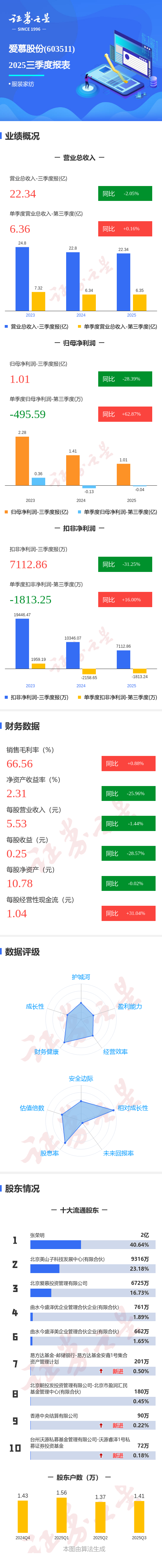 证券之星消息,爱慕股份2025年三季报显示,前三季度公司主营收入22.34亿元,同比下降2.06%;归母净利润1.01亿元,同比下降28.4%;扣非净利润7112.86万元,同比下降31.25%;其中2025年第三季度,公司单季度主营收入6.36亿元,同比上升0.16%;单季度归母净利润-495.59万元,同比上升62.87%;单季度扣非净利润-1813.25万元,同比上升16.0%;负债率14.33%,投资收益2675.45万元,财务费用1131.55万元,毛利率66.56%。