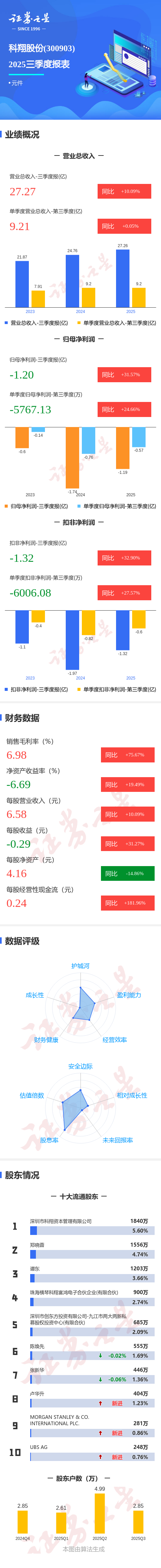 证券之星消息,科翔股份2025年三季报显示,前三季度公司主营收入27.27亿元,同比上升10.1%;归母净利润-1.2亿元,同比上升31.58%;扣非净利润-1.32亿元,同比上升32.9%;其中2025年第三季度,公司单季度主营收入9.21亿元,同比上升0.06%;单季度归母净利润-5767.13万元,同比上升24.66%;单季度扣非净利润-6006.08万元,同比上升27.58%;负债率73.61%,投资收益-86.48万元,财务费用3402.39万元,毛利率6.98%。