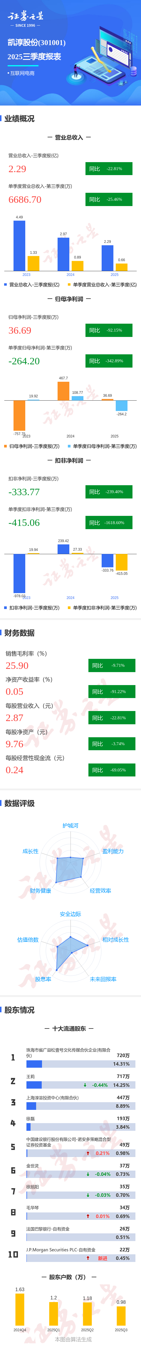 证券之星消息,凯淳股份2025年三季报显示,前三季度公司主营收入2.29亿元,同比下降22.81%;归母净利润36.69万元,同比下降92.15%;扣非净利润-333.77万元,同比下降239.4%;其中2025年第三季度,公司单季度主营收入6686.7万元,同比下降25.46%;单季度归母净利润-264.2万元,同比下降342.9%;单季度扣非净利润-415.06万元,同比下降1618.6%;负债率6.81%,投资收益177.5万元,财务费用-225.83万元,毛利率25.9%。