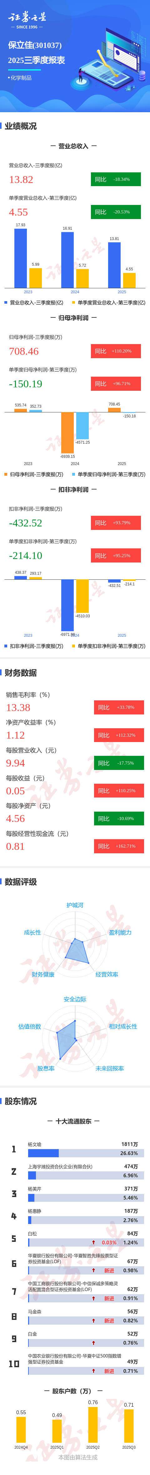 证券之星消息,保立佳2025年三季报显示,前三季度公司主营收入13.82亿元,同比下降18.35%;归母净利润708.46万元,同比上升110.21%;扣非净利润-432.52万元,同比上升93.8%;其中2025年第三季度,公司单季度主营收入4.55亿元,同比下降20.53%;单季度归母净利润-150.19万元,同比上升96.71%;单季度扣非净利润-214.1万元,同比上升95.25%;负债率73.95%,投资收益862.1万元,财务费用3138.7万元,毛利率13.38%。