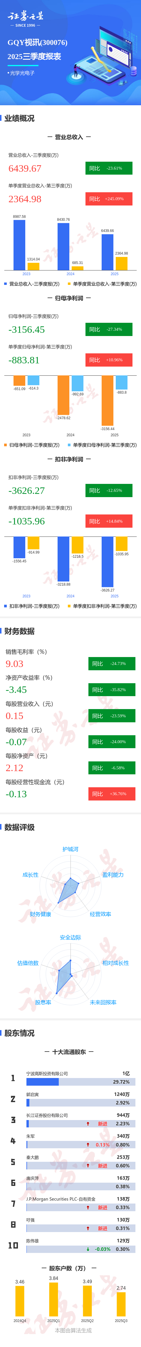证券之星消息,GQY视讯2025年三季报显示,前三季度公司主营收入6439.67万元,同比下降23.62%;归母净利润-3156.45万元,同比下降27.35%;扣非净利润-3626.27万元,同比下降12.66%;其中2025年第三季度,公司单季度主营收入2364.98万元,同比上升245.1%;单季度归母净利润-883.81万元,同比上升10.97%;单季度扣非净利润-1035.96万元,同比上升14.84%;负债率10.31%,投资收益113.59万元,财务费用-277.05万元,毛利率9.03%。