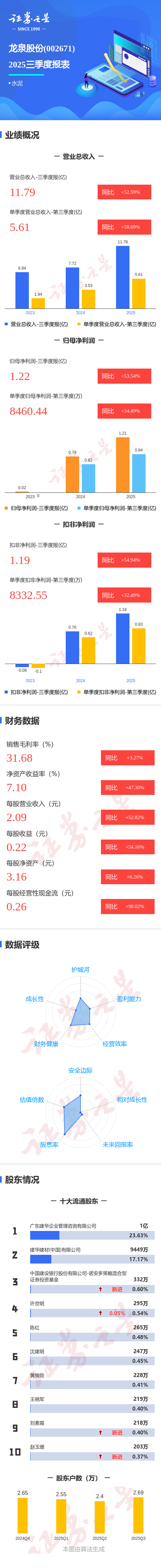 证券之星消息,龙泉股份2025年三季报显示,前三季度公司主营收入11.79亿元,同比上升52.59%;归母净利润1.22亿元,同比上升53.54%;扣非净利润1.19亿元,同比上升54.95%;其中2025年第三季度,公司单季度主营收入5.61亿元,同比上升58.69%;单季度归母净利润8460.44万元,同比上升34.49%;单季度扣非净利润8332.55万元,同比上升32.5%;负债率43.1%,投资收益-128.78万元,财务费用1592.32万元,毛利率31.68%。