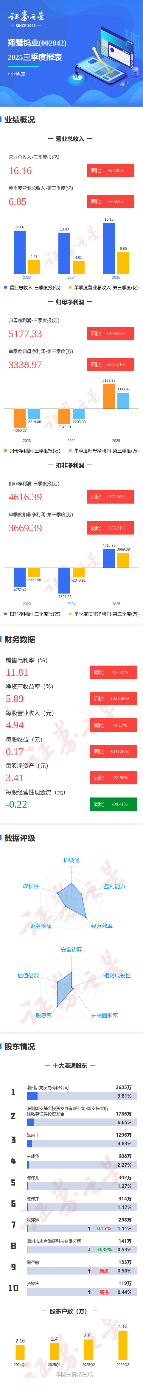 证券之星消息,翔鹭钨业2025年三季报显示,前三季度公司主营收入16.16亿元,同比上升24.0%;归母净利润5177.33万元,同比上升259.65%;扣非净利润4616.39万元,同比上升172.16%;其中2025年第三季度,公司单季度主营收入6.85亿元,同比上升70.64%;单季度归母净利润3338.97万元,同比上升251.22%;单季度扣非净利润3669.39万元,同比上升256.22%;负债率51.91%,投资收益52.96万元,财务费用2857.93万元,毛利率11.81%。