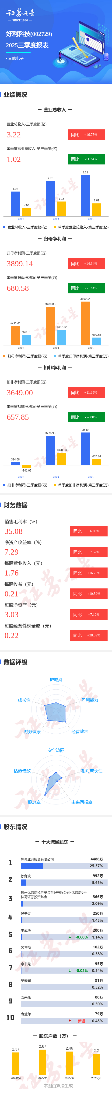 证券之星消息,好利科技2025年三季报显示,前三季度公司主营收入3.22亿元,同比上升16.75%;归母净利润3899.14万元,同比上升14.35%;扣非净利润3649.0万元,同比上升11.35%;其中2025年第三季度,公司单季度主营收入1.02亿元,同比下降11.74%;单季度归母净利润680.58万元,同比下降50.23%;单季度扣非净利润657.85万元,同比下降52.0%;负债率15.65%,投资收益-17.05万元,财务费用-40.99万元,毛利率35.08%。