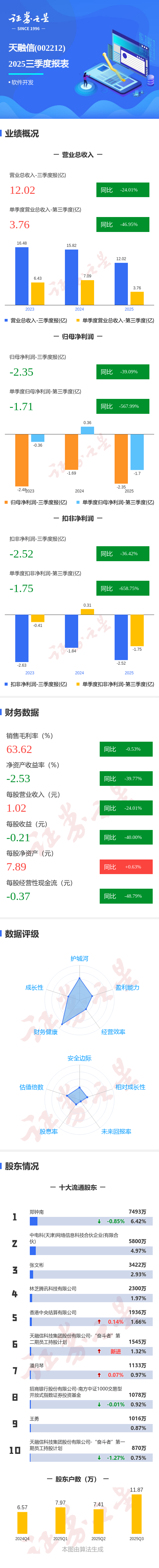 证券之星消息,天融信2025年三季报显示,前三季度公司主营收入12.02亿元,同比下降24.01%;归母净利润-2.35亿元,同比下降39.1%;扣非净利润-2.52亿元,同比下降36.43%;其中2025年第三季度,公司单季度主营收入3.76亿元,同比下降46.96%;单季度归母净利润-1.71亿元,同比下降568.0%;单季度扣非净利润-1.75亿元,同比下降658.75%;负债率13.75%,投资收益-591.92万元,财务费用79.93万元,毛利率63.62%。
